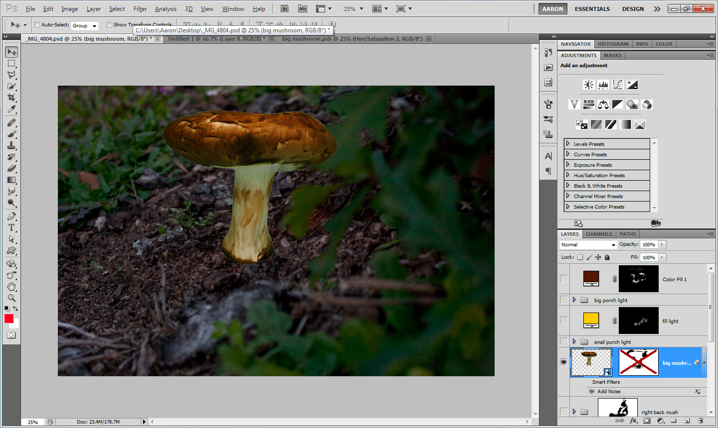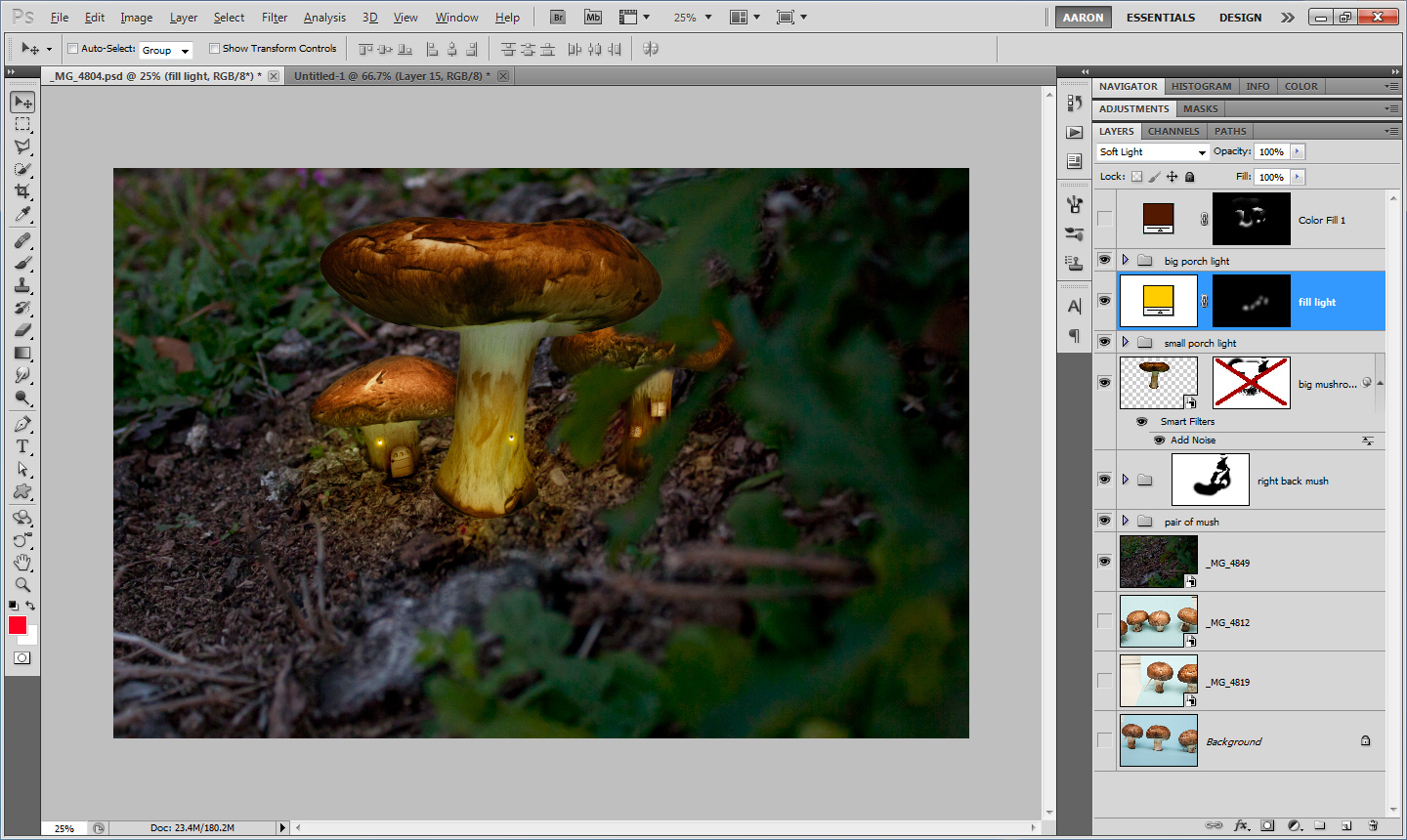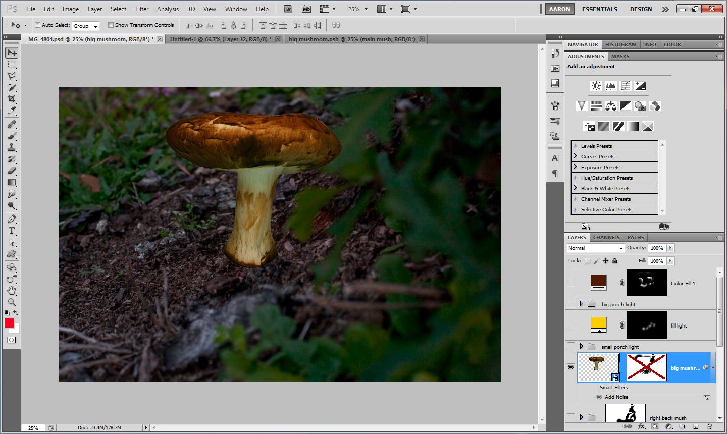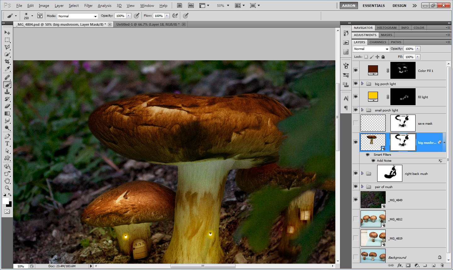 I am going to show how I used various blending methods to believably add mushrooms to a forest scene. We start with this. I chose to leave the leaves in the foreground to create the appearance of "sneaking up" on the scene. ![]() Section IHere is the mushroom as I originally shot it against a baby blue background. I have already applied a rough layer mask using the Channels palette.This is a warped Smart Object. When you warp a smart object it does not destroy pixels, so the transformations become a non-destructive modification. There is a lot of reflected blue light that doesn't match the scene we are compositing into. I might have done some color matching in Adobe Camera Raw before bringing it in to Photoshop, but I chose to color match with adjustment layers. I would suggest bringing the object in as an Camera Raw Smart Object for maximum editability. ![]() I am editing my previously existing PSD document, so some of the layers have already been created and may not be explained in this tutorial. Here, I am editing the smart object of the mushroom layer, big mushroom.psb. I have added a green Color Fill layer set to the Soft Light blend mode. The green has been sampled from the original image. I have also added a Hue/Saturation layer that desaturated all the Cyans in the image. I have clipped these layers to the "main mush" layer, so they are only effecting this layer. ![]() Here is what that looks like. A much better match, but a little green and cold in temperature. We will get there. ![]() Inner Glow will add either a shadow or highlight to the inside edges of a layer. Here we want shadow so we use inner glow set to Multiply and a large pixel size (this is a fairly large image). I used a warming color here, a soft brown. ![]() This is what that looks like in the image. Scroll two images up for comparison. It's subtle but significant, especially near the edges. Here you may also notice I have a disabled layer mask on this layer. I created a mask for this layer fairly early in the process, but I will explain the details of that in a moment. ![]() I added a subtle Add Noise Smart Filter here. I used Add Noise to match the grain in the background of the original and set the blending mode to Darken. (You can set the blending of the smart filter by clicking the triangles-looking logo to the right of the words Add Noise.) ![]() Next I decided to add more warmth and realism by adding porch lights. The brown, white and top yellow shape layers are the light "fixture" and are set at Normal blending and high opacity. The layer defining most of the falloff light is a Soft Light color fill layer with a feathered vector mask and a layer mask added to mask the lighting from the foreground leaves. ![]() Here the other two mushrooms are visible. I added another color fill layer set to Soft Light with the areas where the light is falling painted on a mask with a soft, low opacity brush. ![]() This is an important blending layer. This layer is acting as a shadow on the inside edges of the mushrooms, where "porch light" would not reach if it was a real scene. Using the Multiply blend mode with a color that was picked from the scene casts a realistic shadow. Using colors from your scene for shadows mimics what happens in the real world. One trick I did with this layer is to Ctrl+Click the "big mushroom" layer to create a selection using a transparency mask; then I inverted this selection. This allowed me to paint shadows inside the Color Fill mask without worrying about painting on the foreground mushroom. ![]() Now, onto the layer mask. For the tutorial I wanted to save my original layer mask. I could have saved my selection as an alpha channel, but I used another quick and easy way. I created an empty layer, then Alt+dragged my layer mask to that layer; now I have a copy of my layer mask on the layer I named "save mask." I painted with a soft brush with the leaves, and a large bristled brush for the botttom of the mushroom. Most of the masking looks ok, but I zoomed in here to illustrate another trick with masking. ![]() Compare the left edge of the large mushroom in this image with that of the image above. The version with the softly blurred edge is much more realistic, especially considering that the background of the image is out of focus. If this were a real picture, the edge of this mushroom would not be near as crisp as the one in the above image. ![]() To create this softness, I Ctrl+Clicked the "big mushroom" layer again, then inverted this selection. I then painted on the edge of the mask with a large brush. ![]() Of course, this wouldn't do anything, since there are no pixels on the mask covering any pixels on the actual mushroom. I need to blur the edge of this mask, but I will not use the blur tool. I need a little more control. We are going to use the smudge tool. I used 50% strength and a large brush (700px), I clicked and softly moved back and forth. The red arrow is pointing at the smudge tool itself, not indicating the direction of movement. ![]() This is the final mask for the mushroom. (Most of the rough part of the mask at the bottom is not actually masking anything. It's just a renmant of the large brush I used to mask the bottom of the mushroom.) ![]() And this is the effect of that mask. ![]() Section IINow I will discuss a bit more detail involving layer effects. Here is the window to the mushroom close to how it was originally shot. Again, it sticks out like a sore thumb.![]() This is actually the window from the door. I added some inner and outer glow effects to create the effect of light coming from inside the house. The color is much more green here than it needs to be; this is because I will blend this with other effects later on. ![]() The first blending is using the same Soft Light Color Fill layer I used on the large mushroom. Then I added a Hue/Sat layer set to Colorize to add a brown coloring. Then I added some curves effects to match brightness and contrast. The Curve
