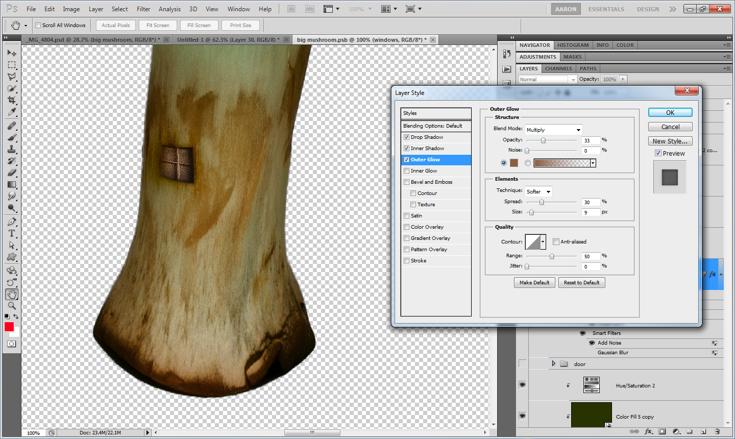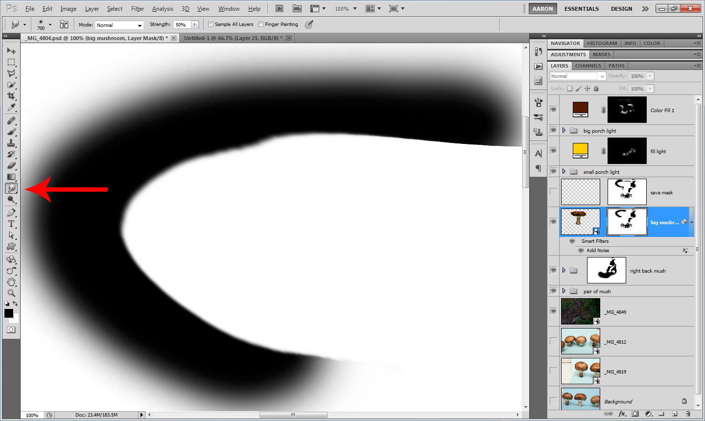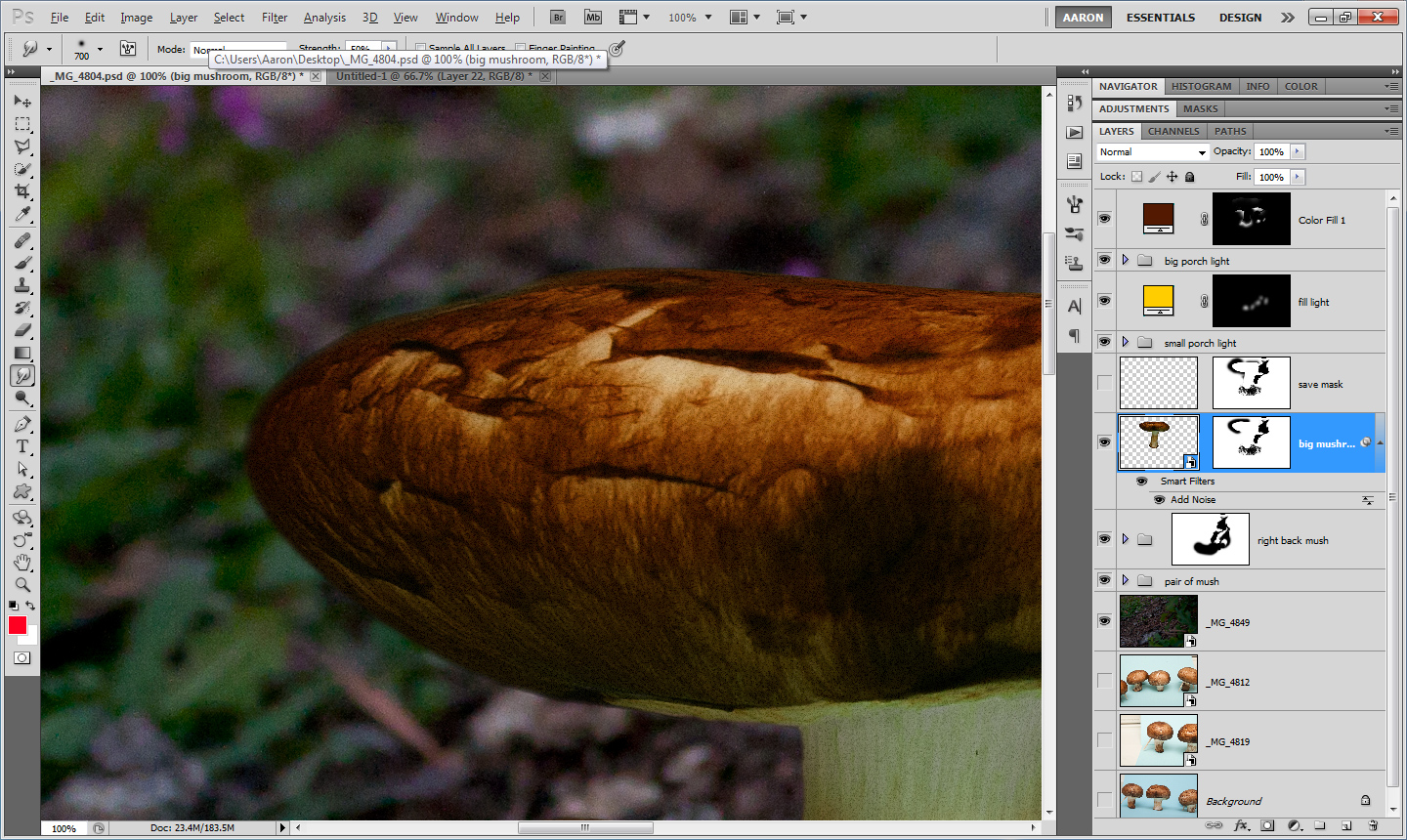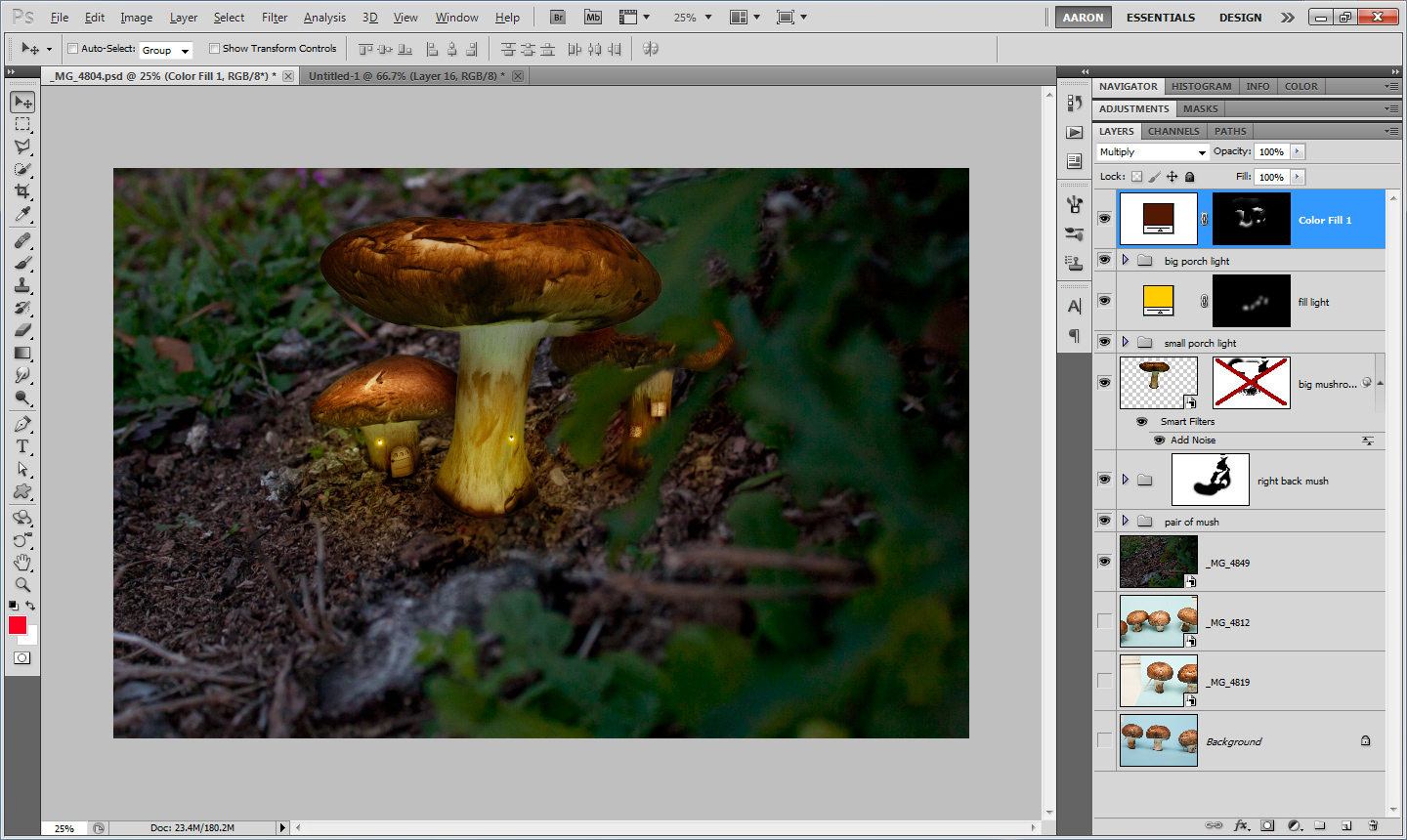 I am going to show how I used various blending methods to believably add mushrooms to a forest scene. We start with this. I chose to leave the leaves in the foreground to create the appearance of "sneaking up" on the scene. ![]() Section IHere is the mushroom as I originally shot it against a baby blue background. I have already applied a rough layer mask using the Channels palette.This is a warped Smart Object. When you warp a smart object it does not destroy pixels, so the transformations become a non-destructive modification. There is a lot of reflected blue light that doesn't match the scene we are compositing into. I might have done some color matching in Adobe Camera Raw before bringing it in to Photoshop, but I chose to color match with adjustment layers. I would suggest bringing the object in as an Camera Raw Smart Object for maximum editability. ![]() I am editing my previously existing PSD document, so some of the layers have already been created and may not be explained in this tutorial. Here, I am editing the smart object of the mushroom layer, big mushroom.psb. I have added a green Color Fill layer set to the Soft Light blend mode. The green has been sampled from the original image. I have also added a Hue/Saturation layer that desaturated all the Cyans in the image. I have clipped these layers to the "main mush" layer, so they are only effecting this layer. ![]() Here is what that looks like. A much better match, but a little green and cold in temperature. We will get there. ![]() Inner Glow will add either a shadow or highlight to the inside edges of a layer. Here we want shadow so we use inner glow set to Multiply and a large pixel size (this is a fairly large image). I used a warming color here, a soft brown. ![]() This is what that looks like in the image. Scroll two images up for comparison. It's subtle but significant, especially near the edges. Here you may also notice I have a disabled layer mask on this layer. I created a mask for this layer fairly early in the process, but I will explain the details of that in a moment. ![]() I added a subtle Add Noise Smart Filter here. I used Add Noise to match the grain in the background of the original and set the blending mode to Darken. (You can set the blending of the smart filter by clicking the triangles-looking logo to the right of the words Add Noise.) ![]() Next I decided to add more warmth and realism by adding porch lights. The brown, white and top yellow shape layers are the light "fixture" and are set at Normal blending and high opacity. The layer defining most of the falloff light is a Soft Light color fill layer with a feathered vector mask and a layer mask added to mask the lighting from the foreground leaves. ![]() Here the other two mushrooms are visible. I added another color fill layer set to Soft Light with the areas where the light is falling painted on a mask with a soft, low opacity brush. ![]() This is an important blending layer. This layer is acting as a shadow on the inside edges of the mushrooms, where "porch light" would not reach if it was a real scene. Using the Multiply blend mode with a color that was picked from the scene casts a realistic shadow. Using colors from your scene for shadows mimics what happens in the real world. One trick I did with this layer is to Ctrl+Click the "big mushroom" layer to create a selection using a transparency mask; then I inverted this selection. This allowed me to paint shadows inside the Color Fill mask without worrying about painting on the foreground mushroom. ![]() Now, onto the layer mask. For the tutorial I wanted to save my original layer mask. I could have saved my selection as an alpha channel, but I used another quick and easy way. I created an empty layer, then Alt+dragged my layer mask to that layer; now I have a copy of my layer mask on the layer I named "save mask." I painted with a soft brush with the leaves, and a large bristled brush for the botttom of the mushroom. Most of the masking looks ok, but I zoomed in here to illustrate another trick with masking. ![]() Compare the left edge of the large mushroom in this image with that of the image above. The version with the softly blurred edge is much more realistic, especially considering that the background of the image is out of focus. If this were a real picture, the edge of this mushroom would not be near as crisp as the one in the above image. ![]() To create this softness, I Ctrl+Clicked the "big mushroom" layer again, then inverted this selection. I then painted on the edge of the mask with a large brush. ![]() Of course, this wouldn't do anything, since there are no pixels on the mask covering any pixels on the actual mushroom. I need to blur the edge of this mask, but I will not use the blur tool. I need a little more control. We are going to use the smudge tool. I used 50% strength and a large brush (700px), I clicked and softly moved back and forth. The red arrow is pointing at the smudge tool itself, not indicating the direction of movement. ![]() This is the final mask for the mushroom. (Most of the rough part of the mask at the bottom is not actually masking anything. It's just a renmant of the large brush I used to mask the bottom of the mushroom.) ![]() And this is the effect of that mask. ![]() Section IINow I will discuss a bit more detail involving layer effects. Here is the window to the mushroom close to how it was originally shot. Again, it sticks out like a sore thumb.![]() This is actually the window from the door. I added some inner and outer glow effects to create the effect of light coming from inside the house. The color is much more green here than it needs to be; this is because I will blend this with other effects later on. ![]() The first blending is using the same Soft Light Color Fill layer I used on the large mushroom. Then I added a Hue/Sat layer set to Colorize to add a brown coloring. Then I added some curves effects to match brightness and contrast. The Curve