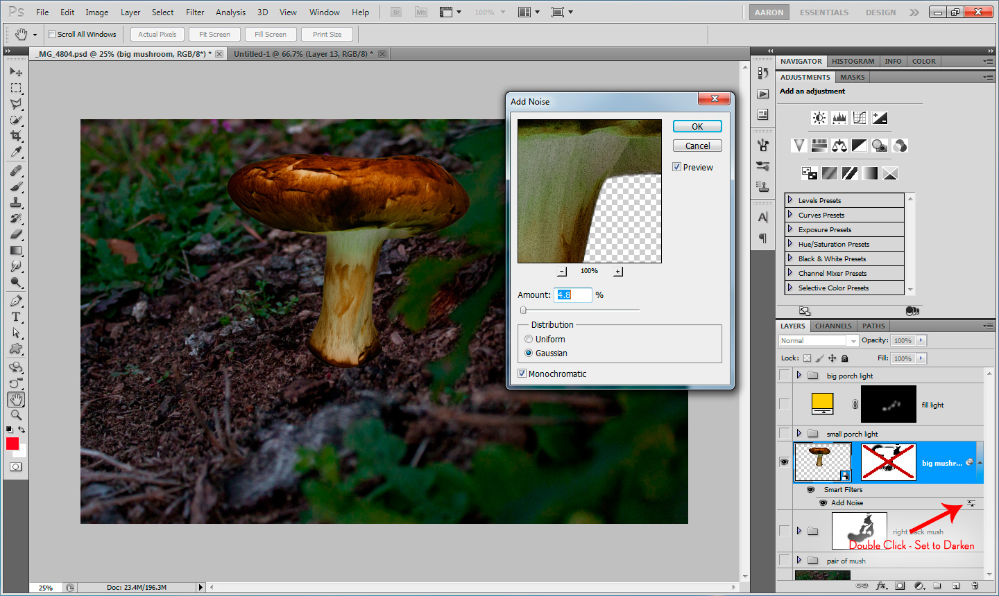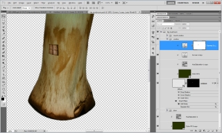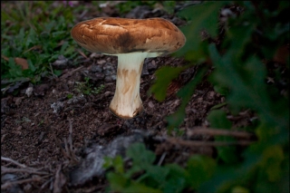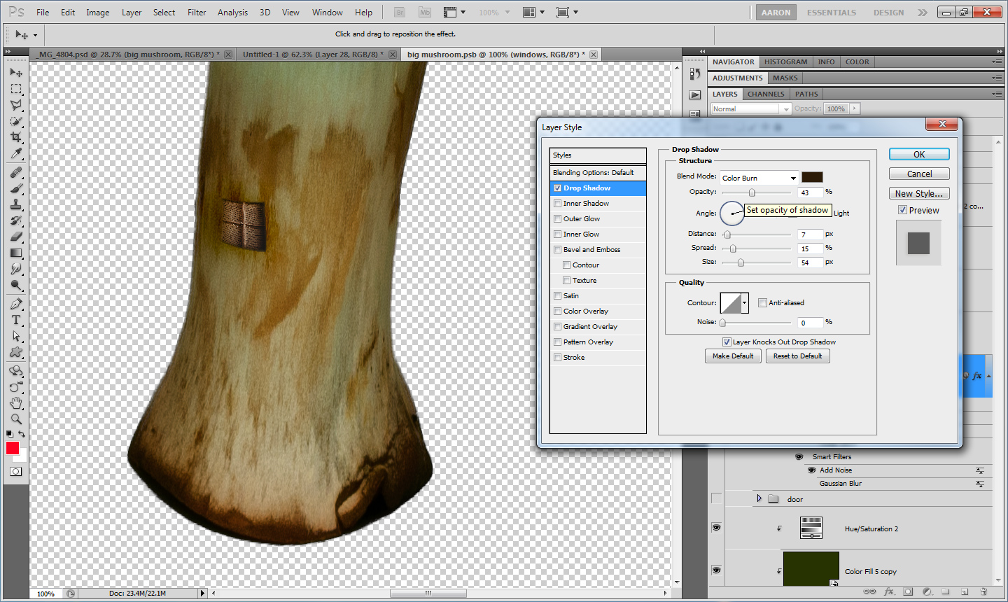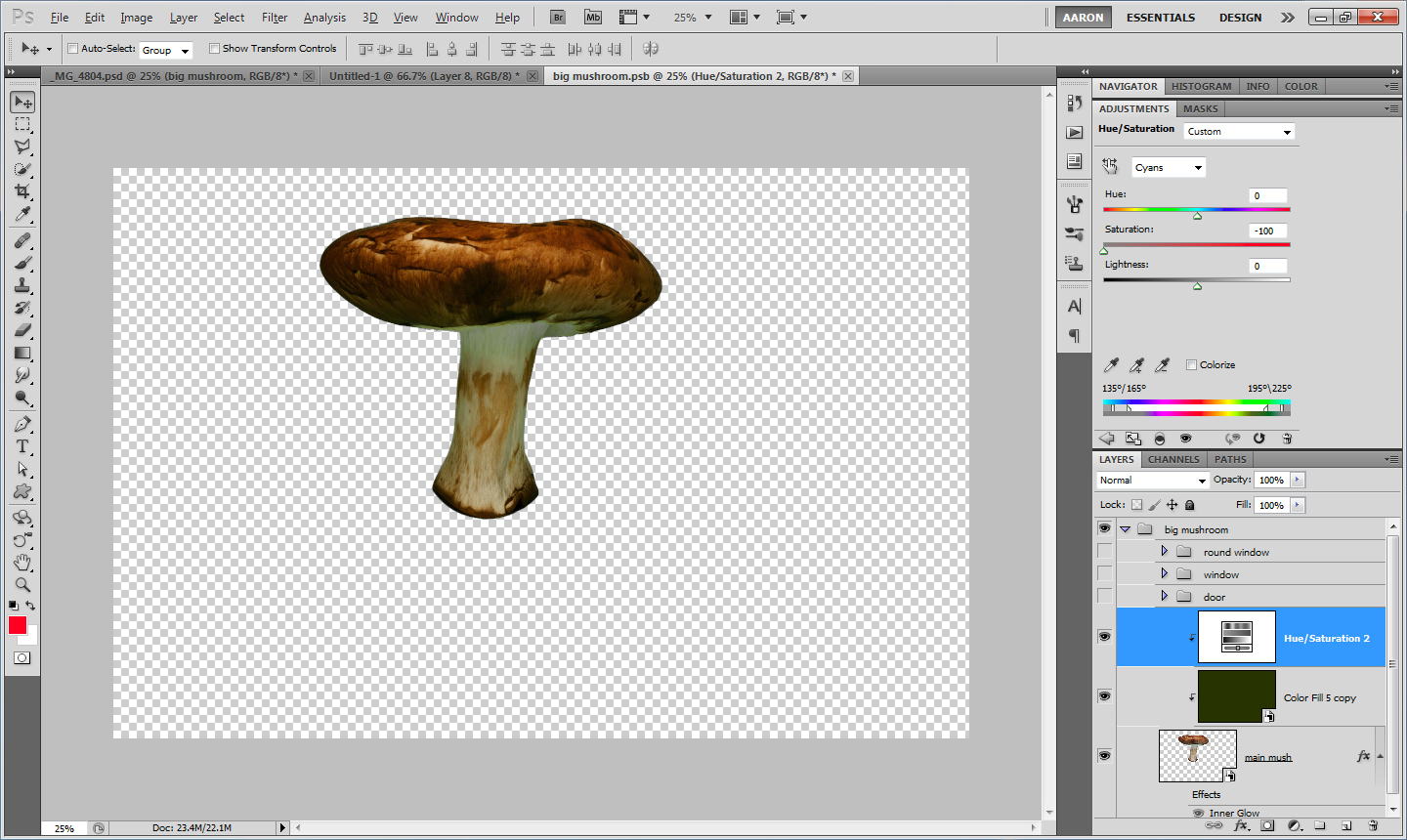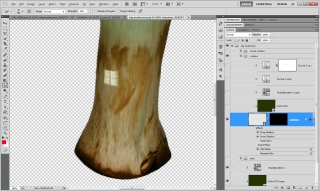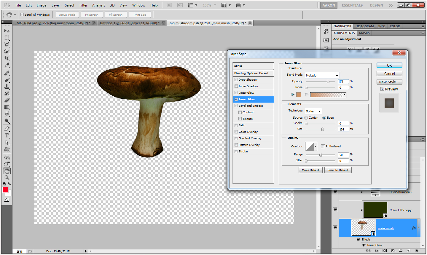 I am going to show how I used various blending methods to believably add mushrooms to a forest scene. We start with this. I chose to leave the leaves in the foreground to create the appearance of "sneaking up" on the scene. ![]() Section IHere is the mushroom as I originally shot it against a baby blue background. I have already applied a rough layer mask using the Channels palette.This is a warped Smart Object. When you warp a smart object it does not destroy pixels, so the transformations become a non-destructive modification. There is a lot of reflected blue light that doesn't match the scene we are compositing into. I might have done some color matching in Adobe Camera Raw before bringing it in to Photoshop, but I chose to color match with adjustment layers. I would suggest bringing the object in as an Camera Raw Smart Object for maximum editability. ![]() I am editing my previously existing PSD document, so some of the layers have already been created and may not be explained in this tutorial. Here, I am editing the smart object of the mushroom layer, big mushroom.psb. I have added a green Color Fill layer set to the Soft Light blend mode. The green has been sampled from the original image. I have also added a Hue/Saturation layer that desaturated all the Cyans in the image. I have clipped these layers to the "main mush" layer, so they are only effecting this layer. ![]() Here is what that looks like. A much better match, but a little green and cold in temperature. We will get there. ![]() Inner Glow will add either a shadow or highlight to the inside edges of a layer. Here we want shadow so we use inner glow set to Multiply and a large pixel size (this is a fairly large image). I used a warming color here, a soft brown. ![]() This is what that looks like in the image. Scroll two images up for comparison. It's subtle but significant, especially near the edges. Here you may also notice I have a disabled layer mask on this layer. I created a mask for this layer fairly early in the process, but I will explain the details of that in a moment. ![]() I added a subtle Add Noise Smart Filter here. I used Add Noise to match the grain in the background of the original and set the blending mode to Darken. (You can set the blending of the smart filter by clicking the triangles-looking logo to the right of the words Add Noise.) ![]() Next I decided to add more warmth and realism by adding porch lights. The brown, white and top yellow shape layers are the light "fixture" and are set at Normal blending and high opacity. The layer defining most of the falloff light is a Soft Light color fill layer with a feathered vector mask and a layer mask added to mask the lighting from the foreground leaves. ![]() Here the other two mushrooms are visible. I added another color fill layer set to Soft Light with the areas where the light is falling painted on a mask with a soft, low opacity brush. ![]() This is an important blending layer. This layer is acting as a shadow on the inside edges of the mushrooms, where "porch light" would not reach if it was a real scene. Using the Multiply blend mode with a color that was picked from the scene casts a realistic shadow. Using colors from your scene for shadows mimics what happens in the real world. One trick I did with this layer is to Ctrl+Click the "big mushroom" layer to create a selection using a transparency mask; then I inverted this selection. This allowed me to paint shadows inside the Color Fill mask without worrying about painting on the foreground mushroom. ![]() Now, onto the layer mask. For the tutorial I wanted to save my original layer mask. I could have saved my selection as an alpha channel, but I used another quick and easy way. I created an empty layer, then Alt+dragged my layer mask to that layer; now I have a copy of my layer mask on the layer I named "save mask." I painted with a soft brush with the leaves, and a large bristled brush for the botttom of the mushroom. Most of the masking looks ok, but I zoomed in here to illustrate another trick with masking. ![]() Compare the left edge of the large mushroom in this image with that of the image above. The version with the softly blurred edge is much more realistic, especially considering that the background of the image is out of focus. If this were a real picture, the edge of this mushroom would not be near as crisp as the one in the above image. ![]() To create this softness, I Ctrl+Clicked the "big mushroom" layer again, then inverted this selection. I then painted on the edge of the mask with a large brush. ![]() Of course, this wouldn't do anything, since there are no pixels on the mask covering any pixels on the actual mushroom. I need to blur the edge of this mask, but I will not use the blur tool. I need a little more control. We are going to use the smudge tool. I used 50% strength and a large brush (700px), I clicked and softly moved back and forth. The red arrow is pointing at the smudge tool itself, not indicating the direction of movement. ![]() This is the final mask for the mushroom. (Most of the rough part of the mask at the bottom is not actually masking anything. It's just a renmant of the large brush I used to mask the bottom of the mushroom.) ![]() And this is the effect of that mask. ![]() Section IINow I will discuss a bit more detail involving layer effects. Here is the window to the mushroom close to how it was originally shot. Again, it sticks out like a sore thumb.![]() This is actually the window from the door. I added some inner and outer glow effects to create the effect of light coming from inside the house. The color is much more green here than it needs to be; this is because I will blend this with other effects later on. ![]() The first blending is using the same Soft Light Color Fill layer I used on the large mushroom. Then I added a Hue/Sat layer set to Colorize to add a brown coloring. Then I added some curves effects to match brightness and contrast. The Curve